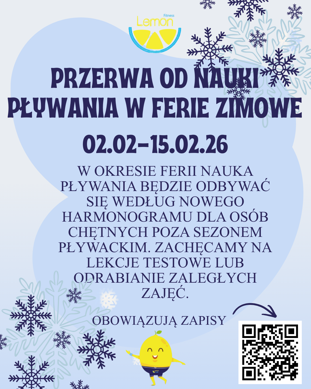 W związku z feriami zimowymi informujemy, że w terminie 02.02–15.02.2026 następuje przerwa w regularnych zajęciach nauki pływania.